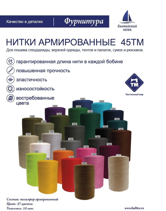 Нитки швейные синтетические 45 ТМ (аналог 45 ЛЛ) отвечают всем нормативам швейной промышленности для армированных ниток, предназначенных для пошива изделий из тканых и нетканых материалов. Также наиболее важные показатели, как разрывные нагрузки, значительно превышают требования ГОСТа.
