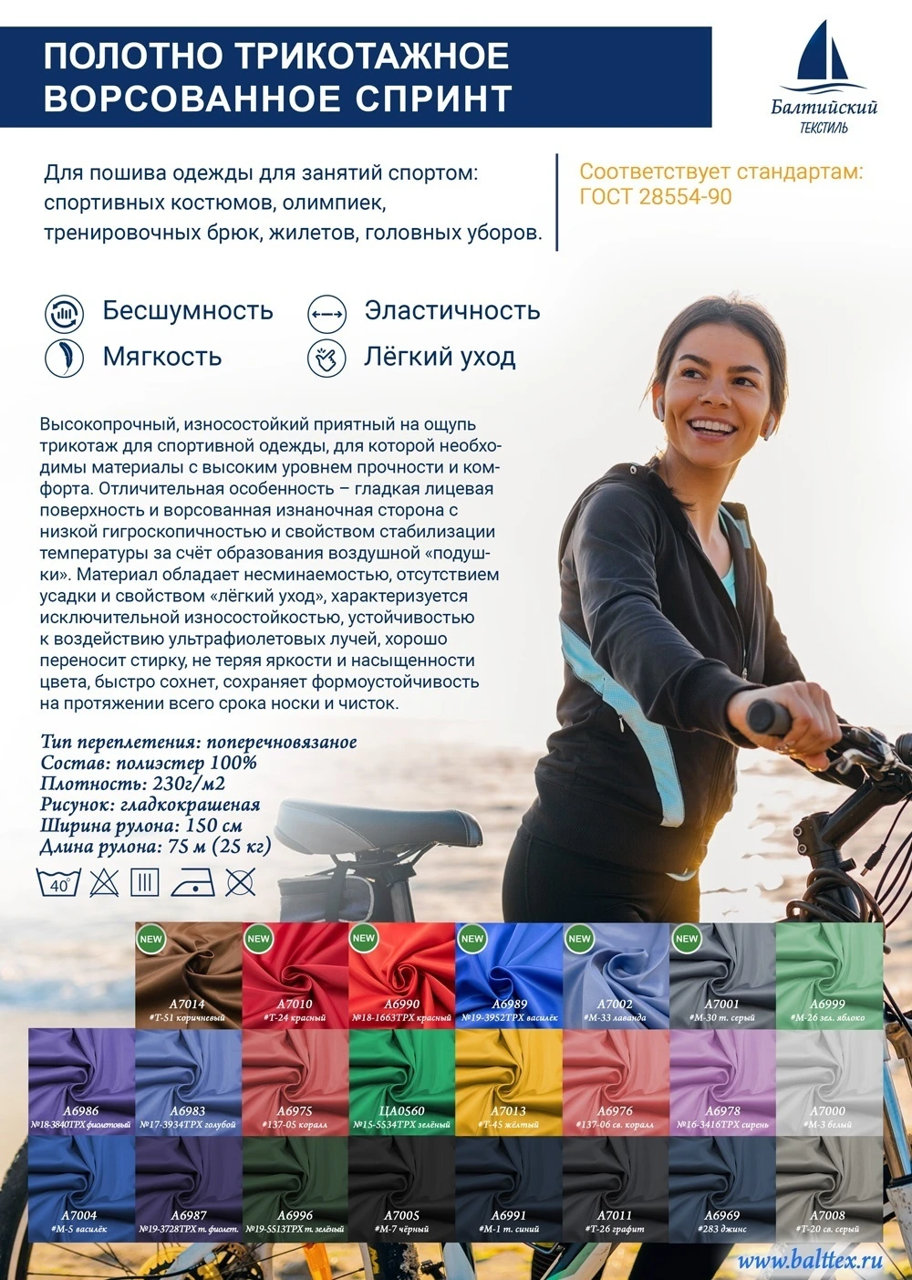 • для спортивной одежды. Ворсованное трикотажное полотно Спринт применяется для пошива спортивной одежды: олимпиек, спортивных костюмов, тренировочных брюк, устойчивых к частым стиркам, быстросохнущих, не требующих глажки или других видов дополнительного ухода.