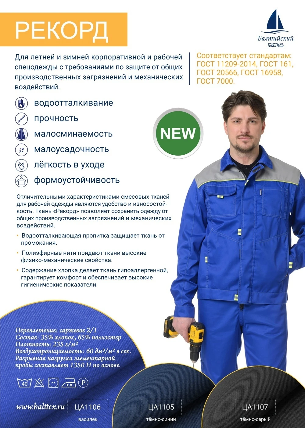 Водоотталкивающая ткань Рекорд — это ткань для создания комфортной специальной и форменной одежды. Смесовая ткань имеет защиту от общих производственных загрязнений и механических воздействий. Отличительными характеристиками ткани являются комфорт и износостойкость.
